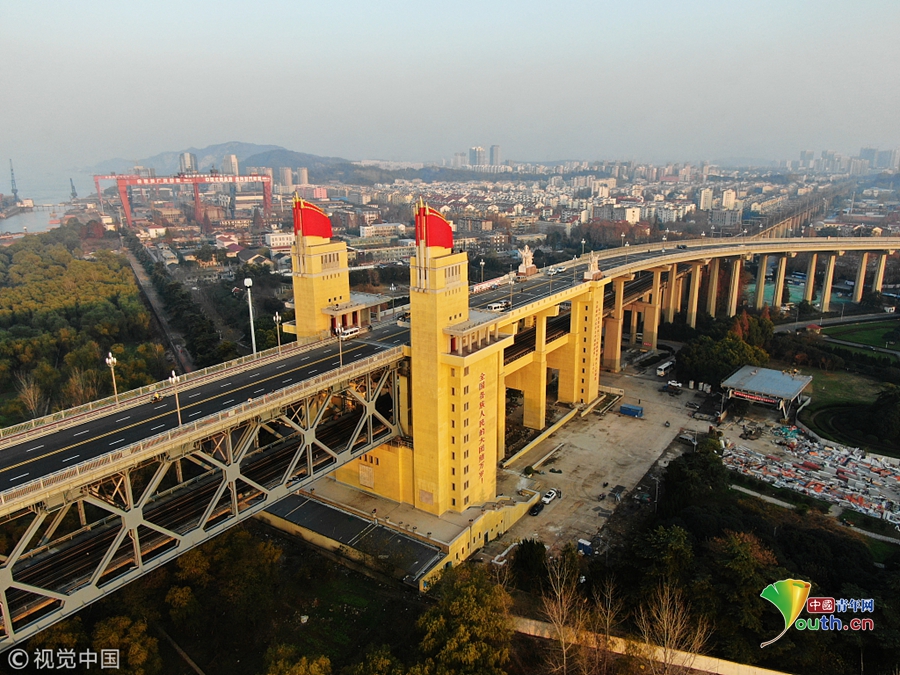 2017年9月19日,南京長江大橋正橋的混凝土面板已經(jīng)全部拆除,僅剩交錯縱橫的鋼桁架橫跨在長江之上,從高空俯瞰猶如一條“鋼鐵巨龍”。