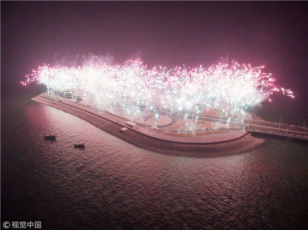 2017年12月31日,港珠澳大橋全線亮燈,標(biāo)志著全線供電照明系統(tǒng)施工圓滿完成,意味著港珠澳大橋主體工程已經(jīng)具備通車條件。亮燈儀式上,大橋東人工島四周燃放起壯麗的煙花。