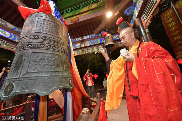 2017年1月1日零時(shí)許,海南三亞南山舉行撞鐘祈福迎新系列民俗文化活動,南山寺僧眾和游客敲響108響吉祥鐘聲,祈福國泰民安,迎接2018年的到來。