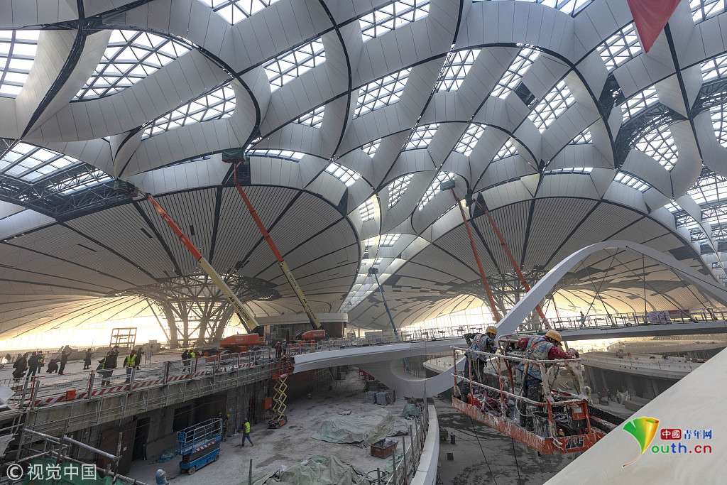 2018年12月19日,北京大興國際機(jī)場航站樓的室內(nèi)裝修在有條不紊的推進(jìn)中。視覺中國