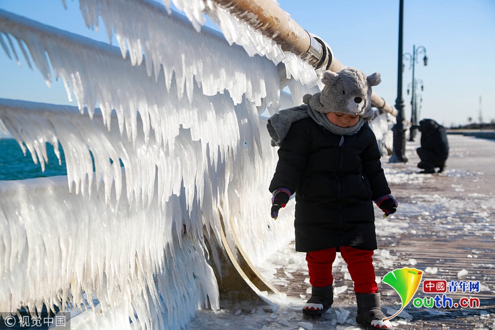 渤海海水在北風(fēng)的作用下涌向岸邊,在大連東港海岸護(hù)欄上凝結(jié)成冰凌,形成約有兩公里的冰凌奇觀。圖為大連市東港海岸護(hù)欄結(jié)滿晶瑩剔透的冰棱。圖片來(lái)源:視覺(jué)中國(guó)
