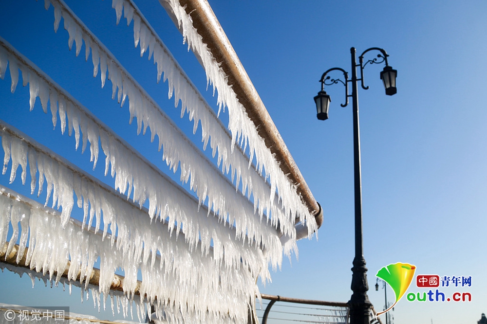 2018年12月29日,大連,晶瑩剔透的冰凌錯落有致的懸掛在東港海岸的木棧道護(hù)欄上,美輪美奐,形成了一道“風(fēng)雕冰琢”的風(fēng)景。