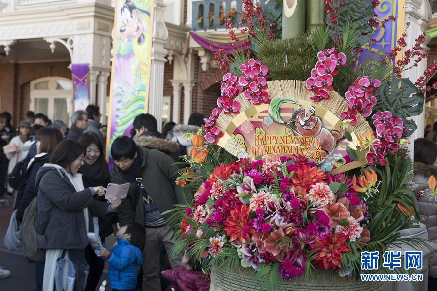 這是1月1日在日本東京迪士尼樂(lè)園拍攝的新年裝飾。 新華社記者杜瀟逸攝