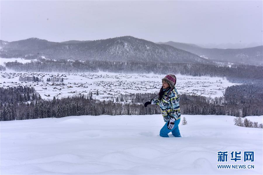1月1日,在新疆禾木雪鄉(xiāng),一名游客體驗積雪厚度。