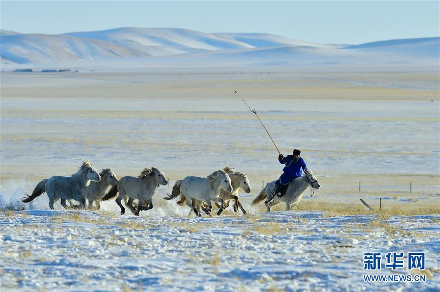1月8日,牧民進(jìn)行套馬表演。 時(shí)下正值草原冬季旅游旺季,內(nèi)蒙古自治區(qū)西烏珠穆沁旗的牧民們?cè)谘┰弦徽股硎?,為游客展現(xiàn)獨(dú)特的民族風(fēng)情。 新華社記者 鄒予 攝