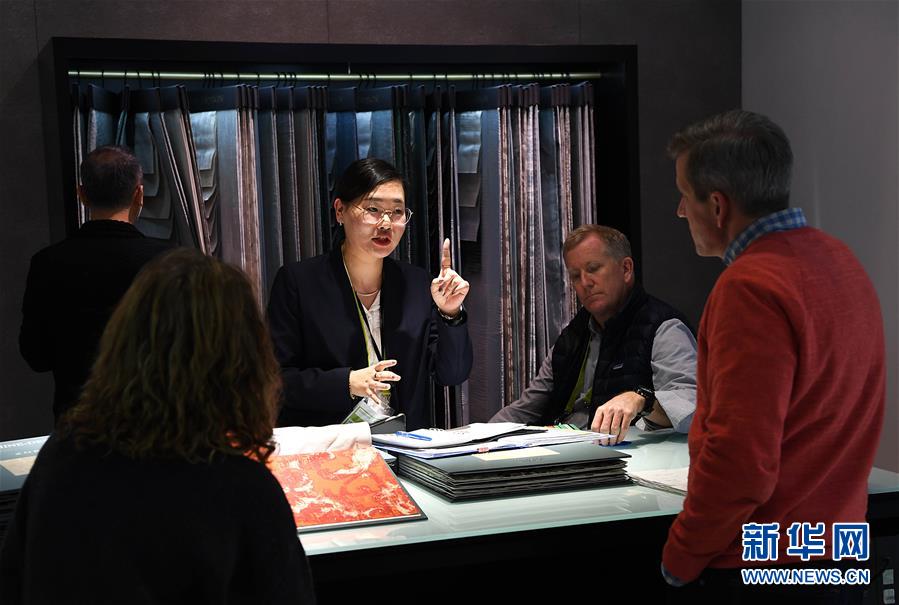 1月8日,在德國(guó)法蘭克福家紡展上,參觀者與一家來(lái)自中國(guó)的展商洽談。 新華社記者 逯陽(yáng) 攝