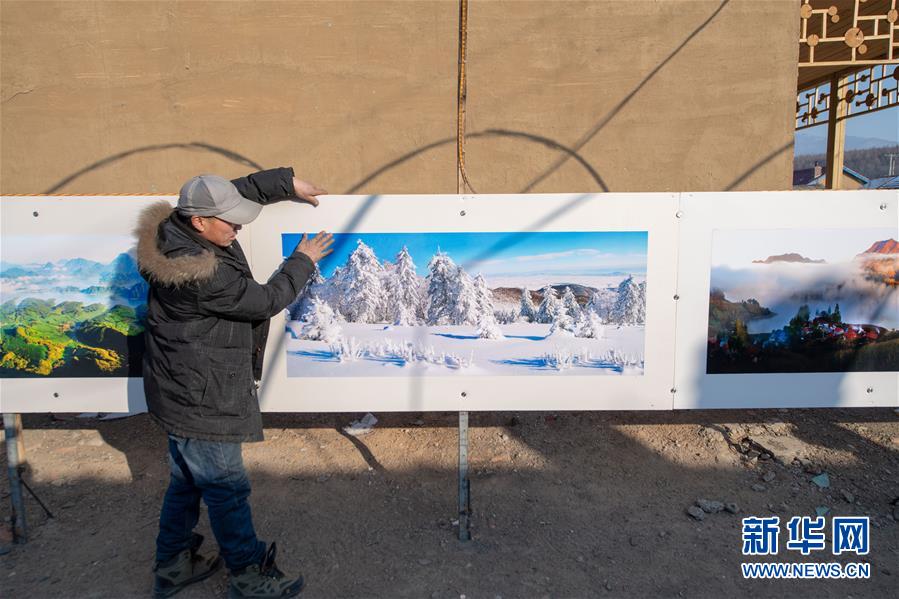 1月10日,在舒蘭市二合屯,農民攝影師李志成將攝影作品擺放在小院內供游客欣賞。 新華社記者張楠攝
