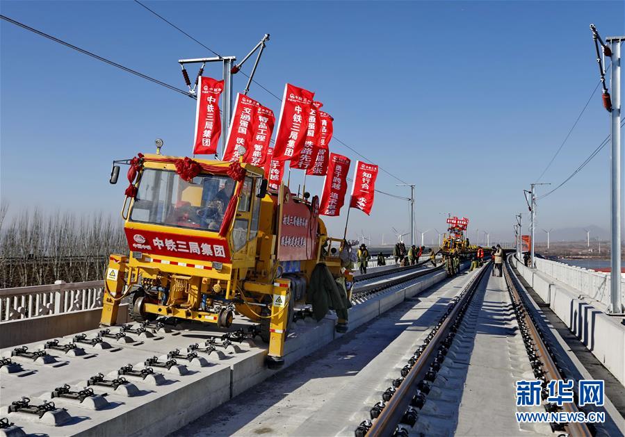 1月13日,中鐵三局的工人在京張高鐵官廳水庫特大橋進(jìn)行鋪軌作業(yè)。 新華社記者 楊世堯 攝