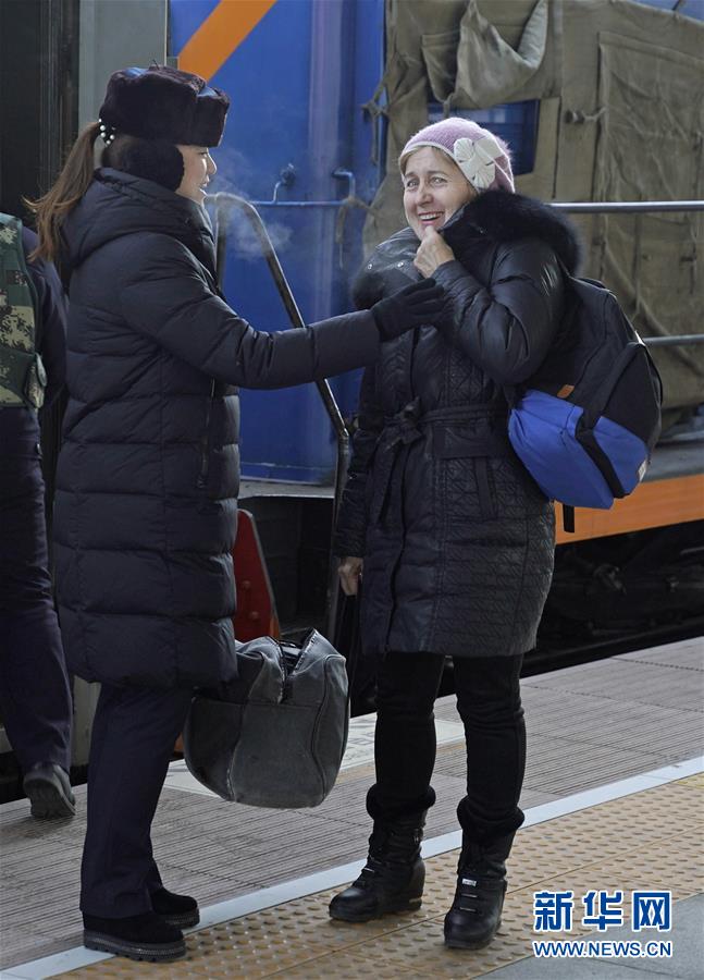 1月11日,在滿洲里火車站站臺,“金鑰匙”服務臺客運員協(xié)助外籍旅客乘車。