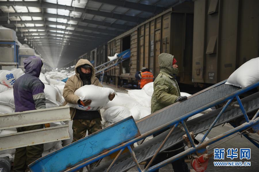 1月12日,在滿洲里鐵路口岸站裝卸二車間化肥作業(yè)場區(qū),工作人員將化肥放上傳送帶。 新華社記者 鄒予 攝