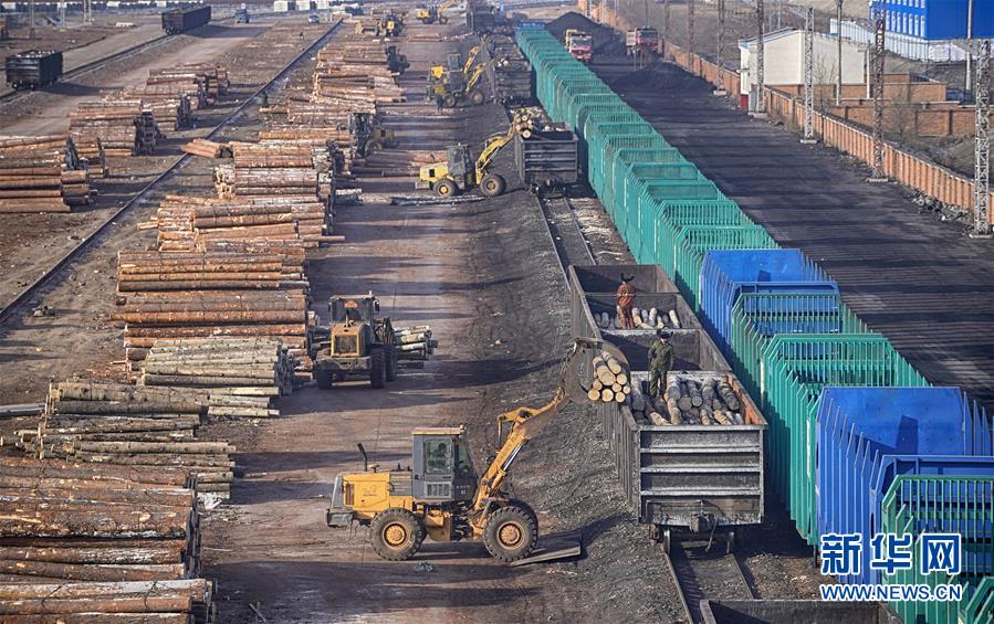 1月12日,在滿洲里鐵路口岸站裝卸二車間原木換裝場區(qū),工作人員進行原木裝車作業(yè)。 新華社記者 才揚 攝