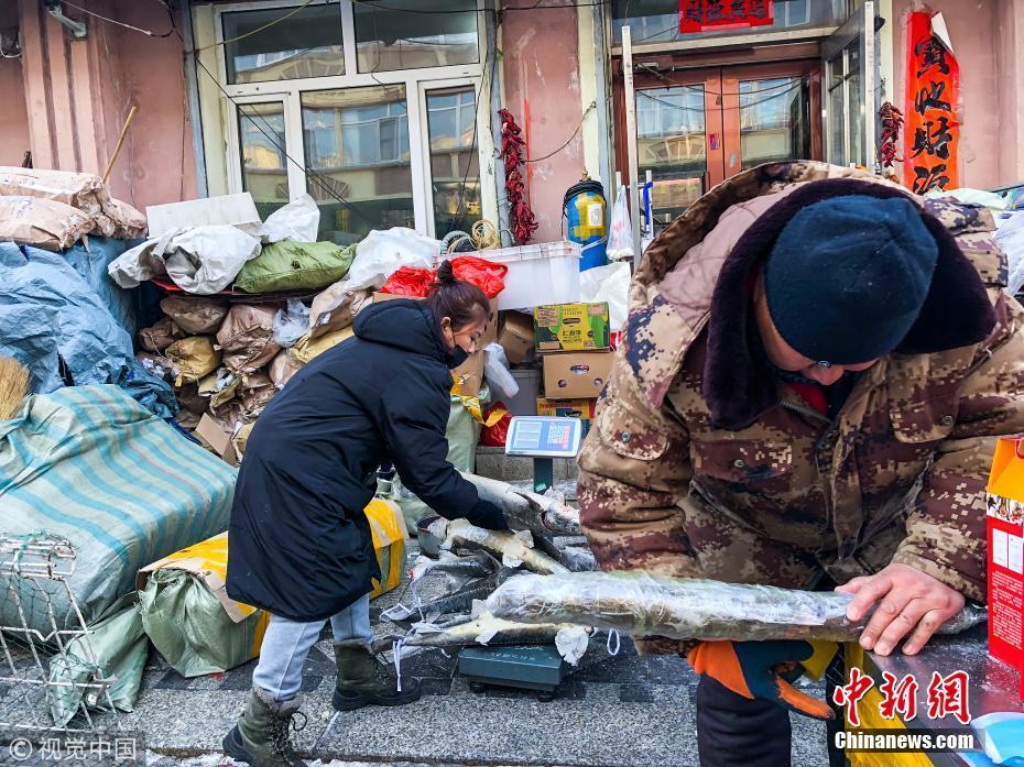 1月12日,黑龍江省佳木斯市撫遠(yuǎn)東極魚市,商戶在整理凍魚。棋簿紫 攝 圖片來源:視覺中國(guó)
