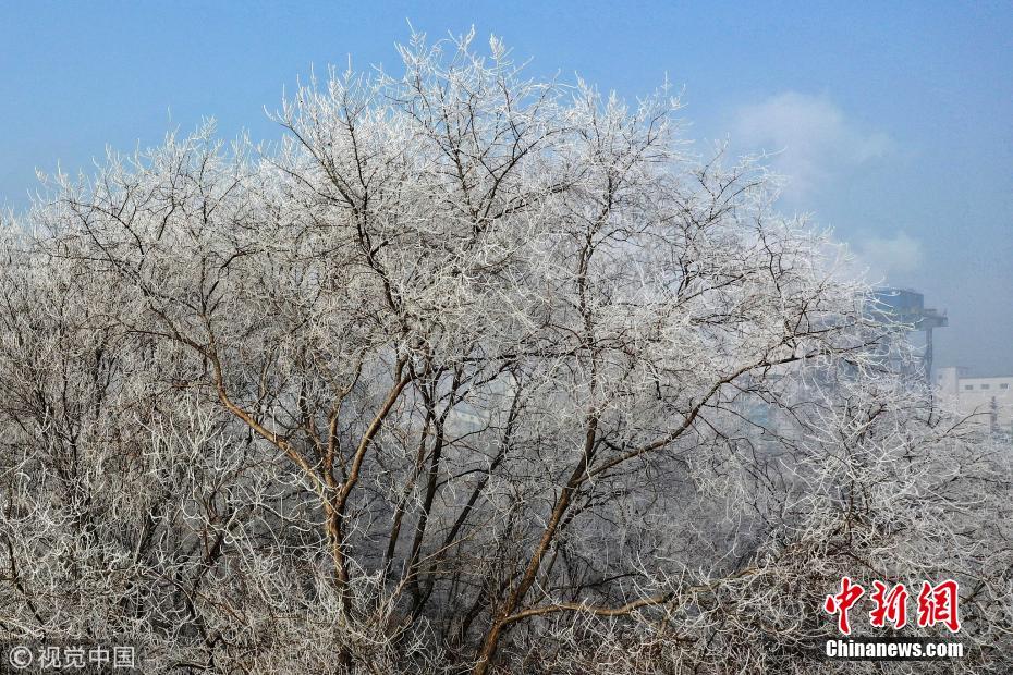 1月13日,霧散日升。河北省邢臺市大街小巷的樹枝上掛滿了潔白晶瑩的霜花,藍(lán)天下微風(fēng)吹拂銀絲閃爍,奇麗壯觀。給臘八節(jié)日增添了亮麗的風(fēng)景?;艏t軍 攝 圖片來源:視覺中國