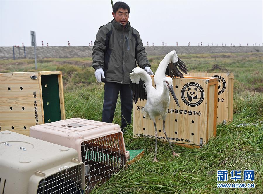 1月14日,工作人員正在放飛一只東方白鸛。