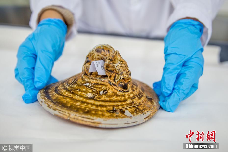 近日,廣東省博物館文物保護(hù)科技中心出水文物保護(hù)實(shí)驗(yàn)室里,一件修復(fù)后的出水明代老虎醬釉罐的蓋子。譚慶駒 攝 圖片來源:視覺中國