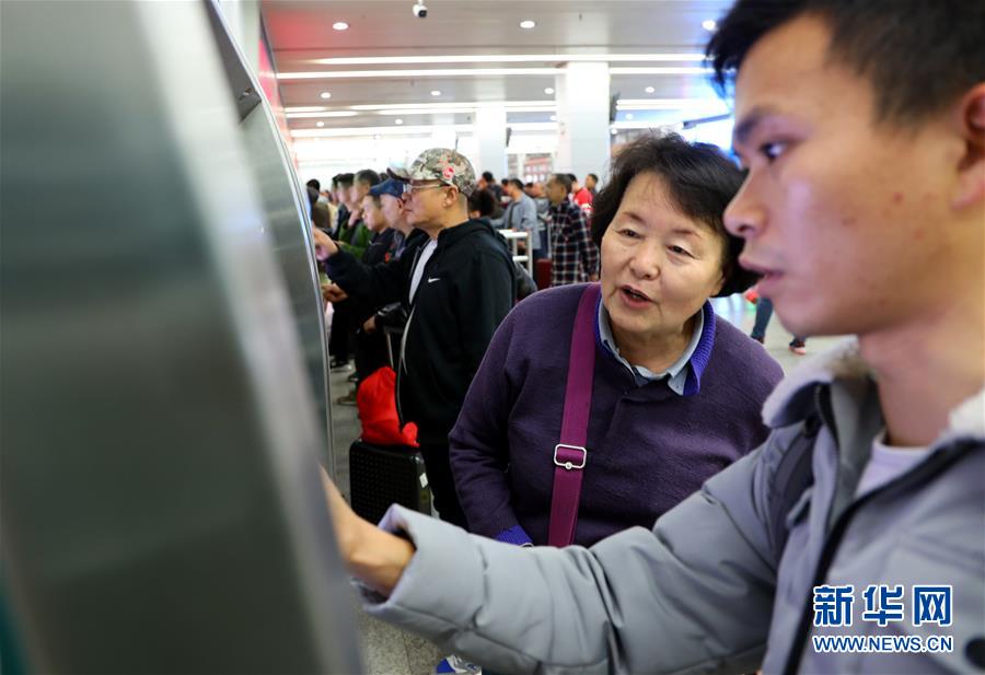1月15日,廣東湛江青年許東濱(右)在廣州火車站售票大廳內(nèi)的自助售票終端上買完車票后,順便幫助一位老人查詢車票信息。 為適應(yīng)互聯(lián)網(wǎng)購(gòu)票旅客比重持續(xù)上升趨勢(shì),廣州火車站在籌備2019年春運(yùn)票務(wù)業(yè)務(wù)時(shí),優(yōu)化互聯(lián)網(wǎng)購(gòu)票取票和退改簽業(yè)務(wù)辦理流程設(shè)計(jì),提升效率,方便旅客出行。 新華社記者劉大偉攝