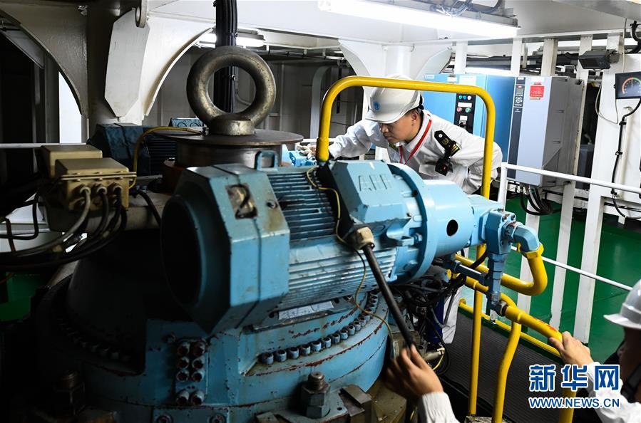1月15日,??诤J戮止ぷ魅藛T在粵海鐵4號客滾船的機(jī)艙內(nèi)檢查舵機(jī)。