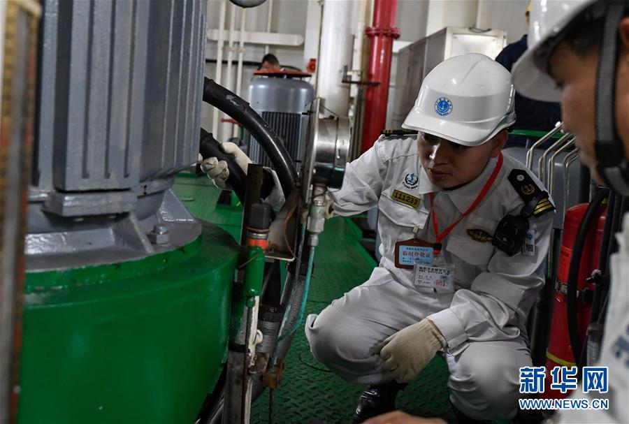 1月15日,海口海事局工作人員在粵海鐵4號(hào)客滾船的機(jī)艙內(nèi)進(jìn)行檢查。新華社記者 楊冠宇 攝