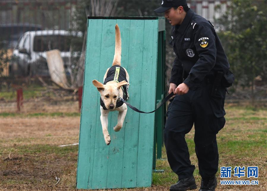 1月15日,警犬“皮特”在訓(xùn)導(dǎo)員丁巖的帶領(lǐng)下進行崗前特訓(xùn)。新華社記者 程敏 攝