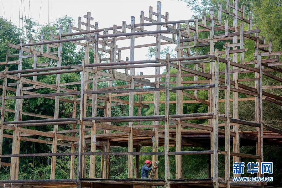 1月15日,在廣西融水苗族自治縣融水鎮(zhèn)夢嗚苗寨,工人在吊腳樓的主要結(jié)構上施工。新華社記者 陳君清 攝