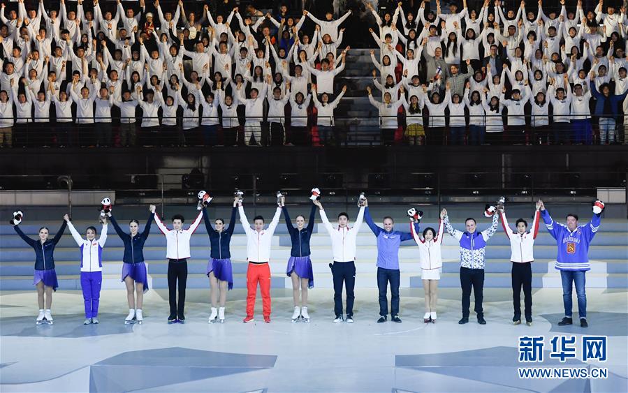1月15日,中芬運動員代表攜手向觀眾致意。 當(dāng)日,“2019中芬冬季運動年”開幕式在北京首鋼冰球館舉行。 新華社記者申宏攝