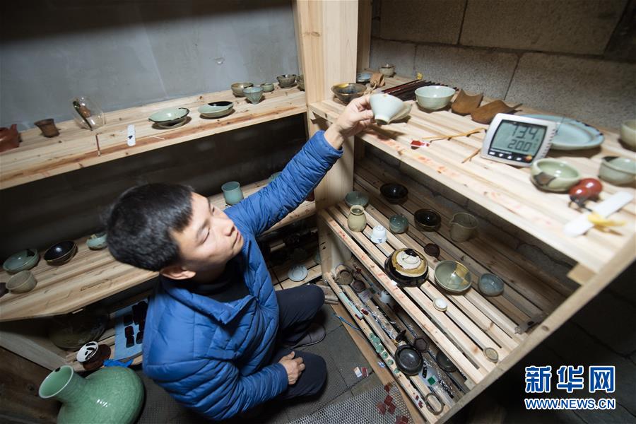 1月15日,吳榮強(qiáng)在龍泉市牛頭嶺村“七分醉”工作室對一件青瓷器皿進(jìn)行漆繕。 新華社記者翁忻旸攝
