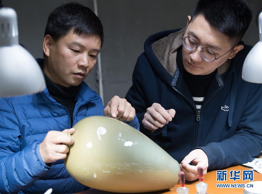 1月15日,吳榮強(qiáng)(右)和徒弟在龍泉市牛頭嶺村“七分醉”工作室曬漆。 新華社記者翁忻旸攝
