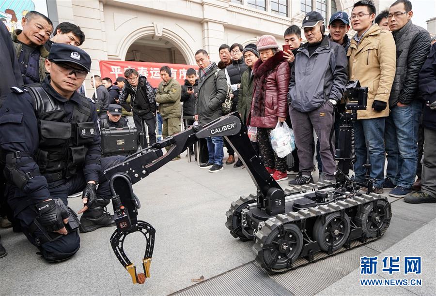 1月16日,旅客們在觀看警用排爆機器人演示。 當日,武漢鐵路公安處在漢口火車站舉行警營開放日活動,讓旅客零距離接觸警務安全工作,營造良好的春運出行環(huán)境。 新華社記者程敏攝