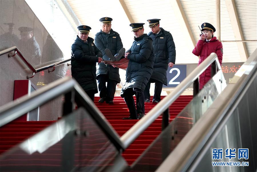 1月16日,鶴壁東站的職工在進(jìn)行列車下交重傷病旅客應(yīng)急演練。 當(dāng)日,中國鐵路鄭州局集團(tuán)有限公司新鄉(xiāng)車務(wù)段鶴壁東站組織職工開展服務(wù)禮儀、手語等業(yè)務(wù)培訓(xùn),并進(jìn)行非正常情況應(yīng)急演練,為2019年春運(yùn)做準(zhǔn)備。 新華社記者李安攝