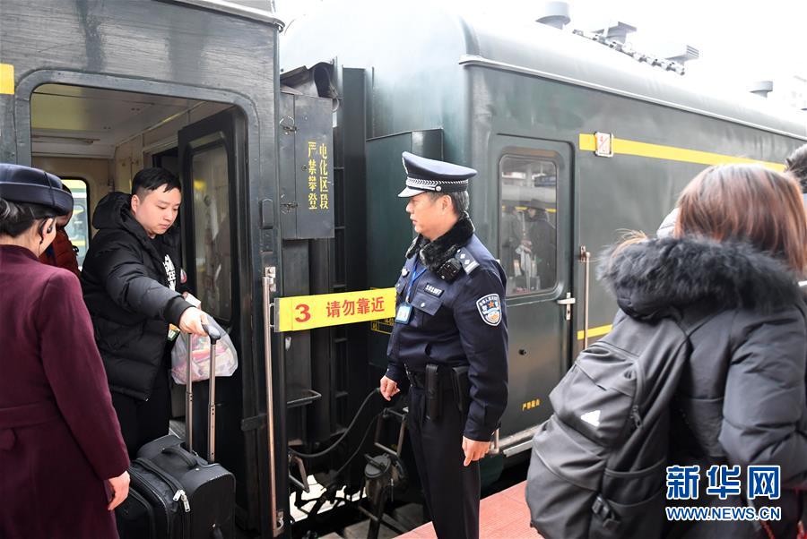 在廣西憑祥火車站,鐵路公安民警陸日峰在一列準(zhǔn)備開往越南的火車旁值勤(2018年12月31日攝)。 新華社記者陸波岸攝