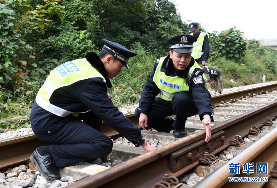 鐵路公安民警陸日峰(左二)和同事在中越邊境巡線時(shí)檢查鐵軌情況(2018年12月31日攝)。 新華社記者陸波岸攝