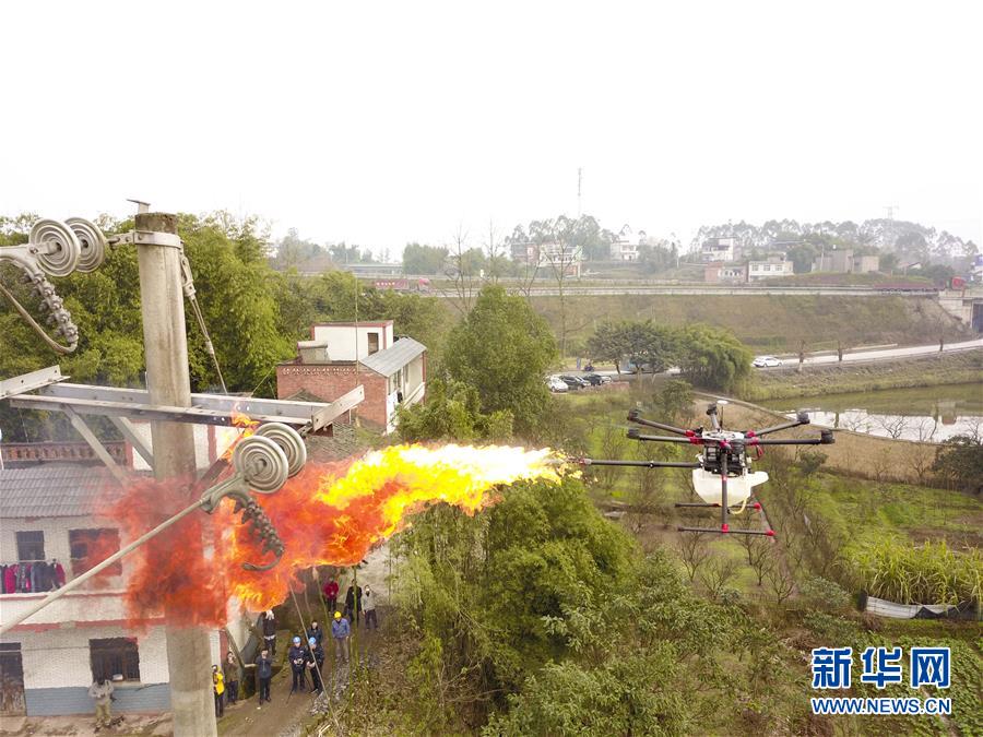 1月16日,噴火清障無人機(jī)在國網(wǎng)重慶永川供電公司無人機(jī)班操作手的控制下,對重慶市永川區(qū)大安街道小坎村10千伏隆安線16號桿處的一個(gè)馬蜂窩進(jìn)行噴火清除(無人機(jī)航拍)。 1月16日,經(jīng)過3年多的研發(fā)和測試,重慶首臺噴火清障無人機(jī)在國網(wǎng)重慶永川供電公司無人機(jī)班正式投用。這臺多旋翼無人機(jī),通過搭載帶有燃料箱、油泵、自動點(diǎn)火裝置的噴火吊艙任務(wù)模塊,可以對影響高空電力線路安全的飄掛物進(jìn)行定點(diǎn)障礙清除作業(yè)。 據(jù)噴火清障無人機(jī)研發(fā)負(fù)責(zé)人何濤介紹,過去高空清除異物主要靠人工進(jìn)行,為保證安全經(jīng)常需要停電作業(yè),因此他們結(jié)合實(shí)際工作經(jīng)驗(yàn)和高空電力線路的自身特點(diǎn),設(shè)計(jì)和制造出了噴火清障無人機(jī)。2018年測試期間,國網(wǎng)重慶永川供電公司無人機(jī)班在多種環(huán)境下成功執(zhí)行了50多次高空電力線路清障作業(yè)。 新華社記者 劉潺 攝