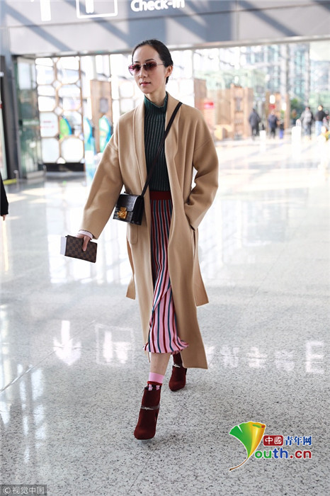 2019年1月17日,上海,韓雪現(xiàn)身機場,穿著條紋紗裙露出小腿,十分抗凍,她搭配經典的駝色大衣,氣質出眾在機場人群中相當搶鏡。