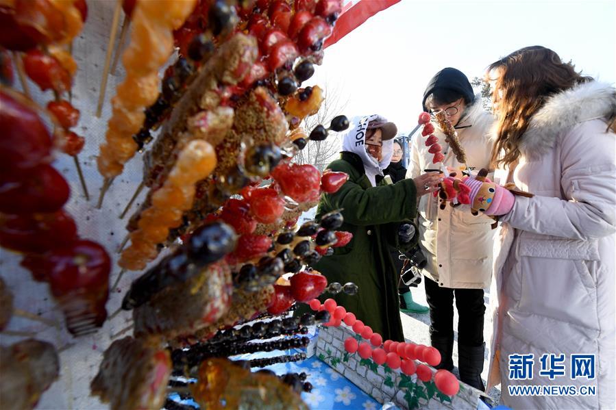 1月24日,在黑龍江省漠河市北極村,顧客在“最北糖葫蘆”攤買(mǎi)糖葫蘆。新華社記者王毓國(guó)攝
