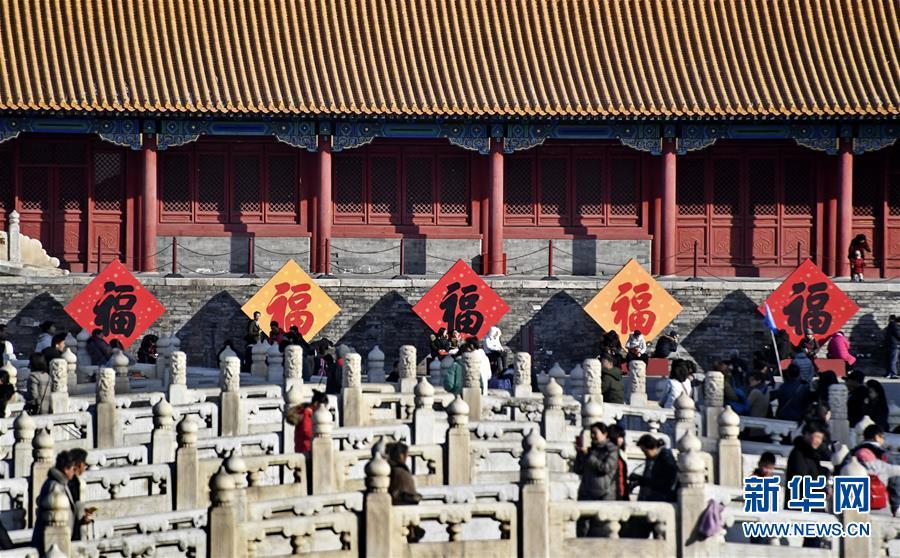 1月25日,游人在故宮內(nèi)的“五?!鼻傲粲啊?春節(jié)將至,北京故宮博物院內(nèi)張燈結(jié)彩,到處懸掛著宮燈、萬壽燈、年畫、門神、福字等古代宮廷節(jié)日裝飾品,讓來自國(guó)內(nèi)外的游人感受到濃濃的年味。 新華社記者 李欣攝