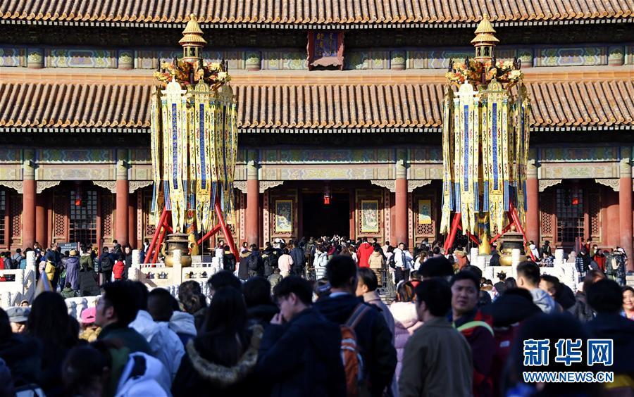 這是在故宮內(nèi)拍攝的宮廷萬壽燈(1月25日攝)。 春節(jié)將至,北京故宮博物院內(nèi)張燈結(jié)彩,到處懸掛著宮燈、萬壽燈、年畫、門神、福字等古代宮廷節(jié)日裝飾品,讓來自國內(nèi)外的游人感受到濃濃的年味。 新華社記者 李欣攝