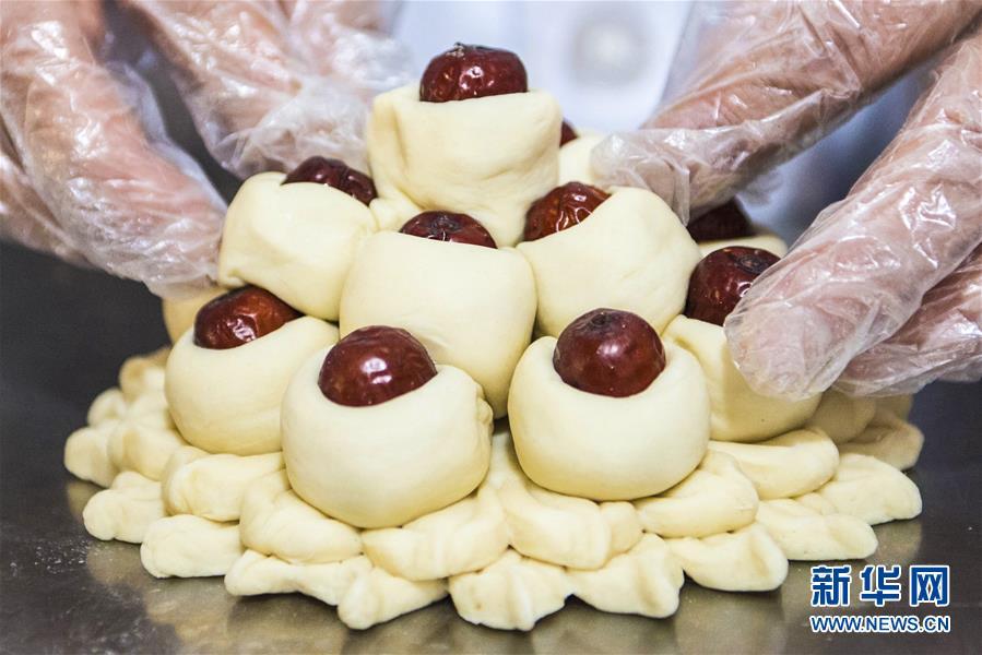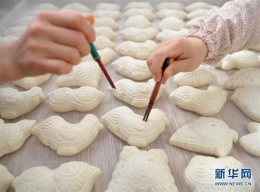 1月31日,河北省黃驊市一家面花作坊的工人給剛剛出籠的面花點上寓意吉祥喜慶的紅點。 河北黃驊市有著過年蒸面花的習俗。春節(jié)前夕,當?shù)孛婊ㄖ谱鞴S加班加點制作面花,供應春節(jié)市場。 新華社記者牟宇攝