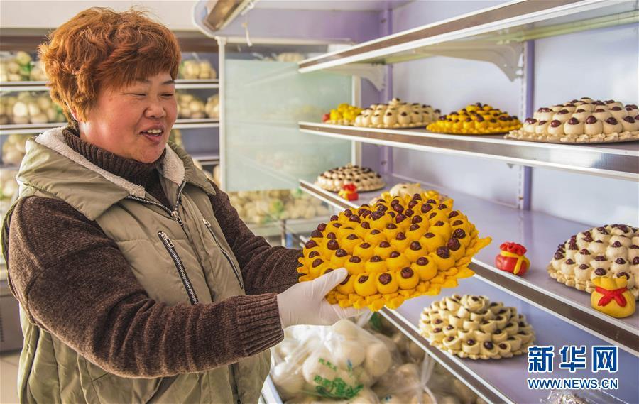 1月31日,河北黃驊市一家面花作坊的工人在查看面花。 河北黃驊市有著過年蒸面花的習俗。春節(jié)前夕,當?shù)孛婊ㄖ谱鞴S加班加點制作面花,供應春節(jié)市場。 新華社記者牟宇攝