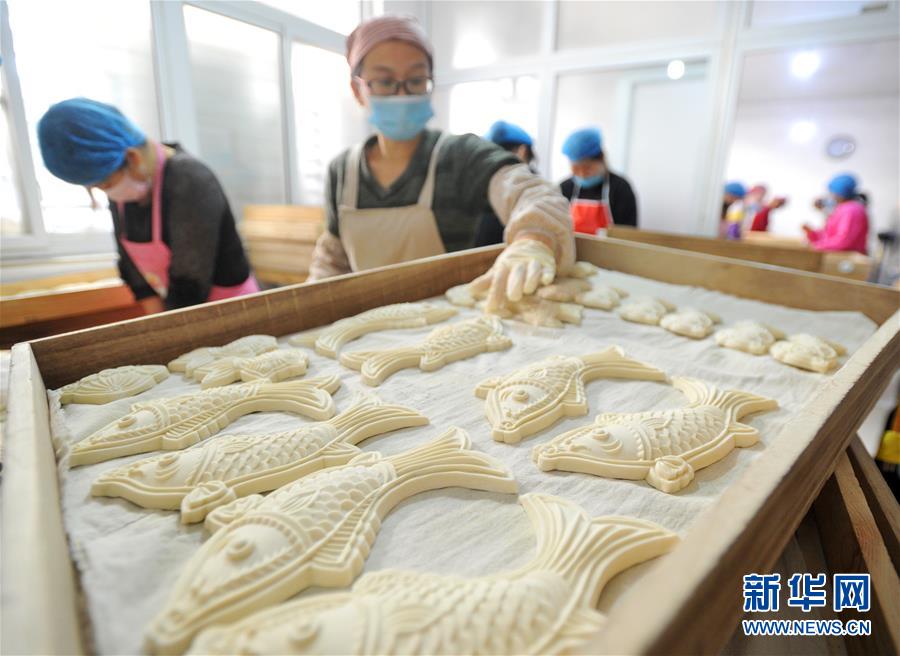 1月31日,河北黃驊市一家面花作坊的工人用面花模子制作面花。 河北黃驊市有著過年蒸面花的習俗。春節(jié)前夕,當?shù)孛婊ㄖ谱鞴S加班加點制作面花,供應春節(jié)市場。 新華社記者牟宇攝