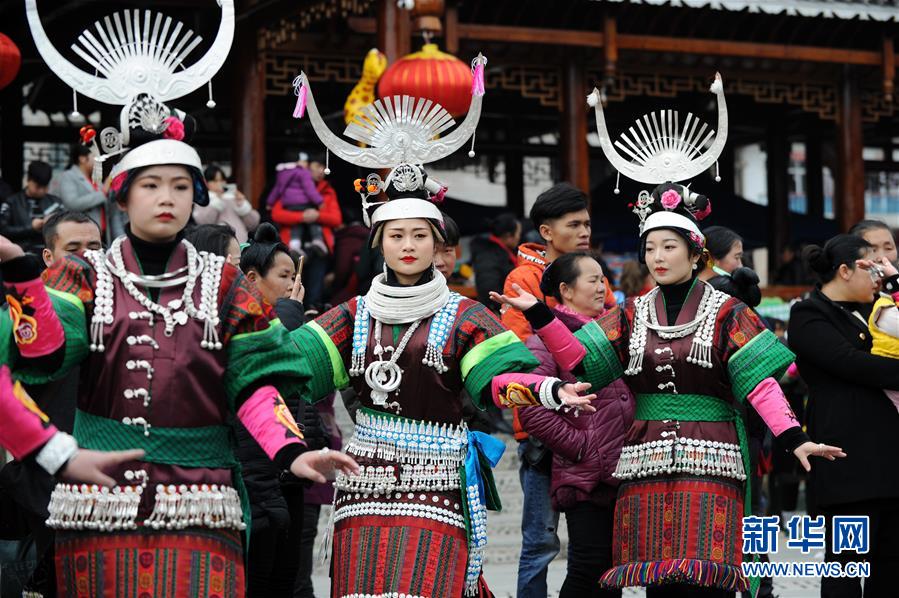 2月24日,在貴州省凱里市舟溪鎮(zhèn),苗族姑娘身著盛裝跳蘆笙舞。 當日,在貴州省黔東南苗族侗族自治州凱里市舟溪鎮(zhèn),來自各地的苗族群眾身著節(jié)日盛裝,歡聚在古老的“甘囊香”蘆笙堂,男子吹奏起蘆笙,姑娘和孩子們跳起蘆笙舞,歡度新春,祈求風調(diào)雨順、五谷豐登,青年男女也借此良日尋覓意中人。 “甘囊香”是苗語音譯,意思為“河流的下游,神仙匯聚的地方”?!案誓蚁恪碧J笙會是貴州規(guī)模最大、最古樸的苗族蘆笙會之一。 新華社記者楊文斌攝