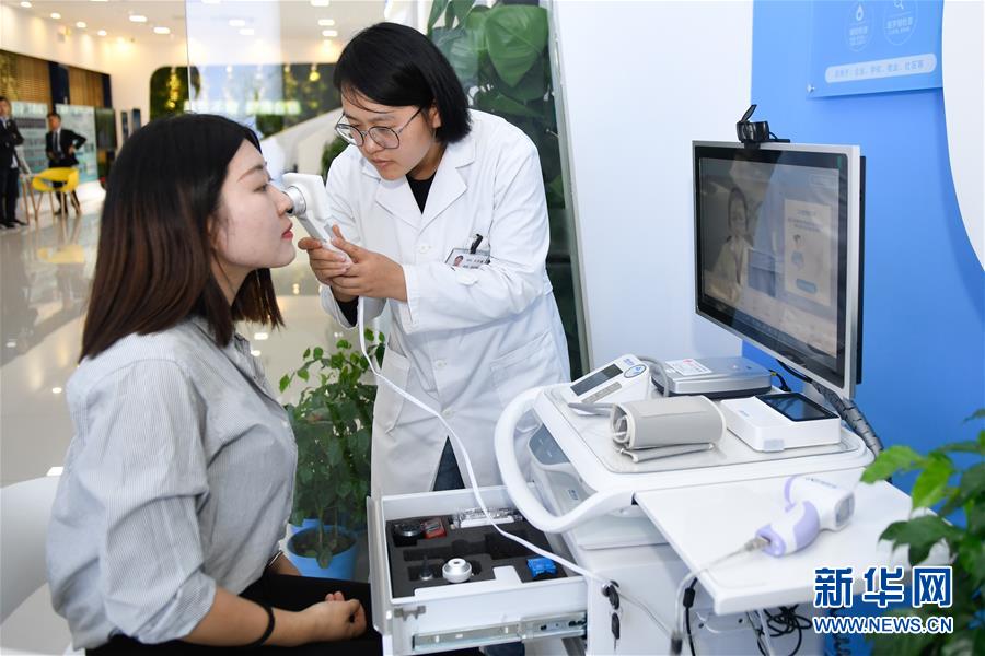11月6日,參觀者在烏鎮(zhèn)互聯(lián)網(wǎng)醫(yī)院體驗“智能醫(yī)務(wù)室”的體檢功能。據(jù)了解,“智能醫(yī)務(wù)室”由智能移動醫(yī)療一體機、智能藥柜以及一系列檢查設(shè)備組成,根據(jù)健康檔案和檢查結(jié)果,視頻連接家庭醫(yī)生就能解決常見的醫(yī)療健康問題。 新華社記者黃宗治攝
