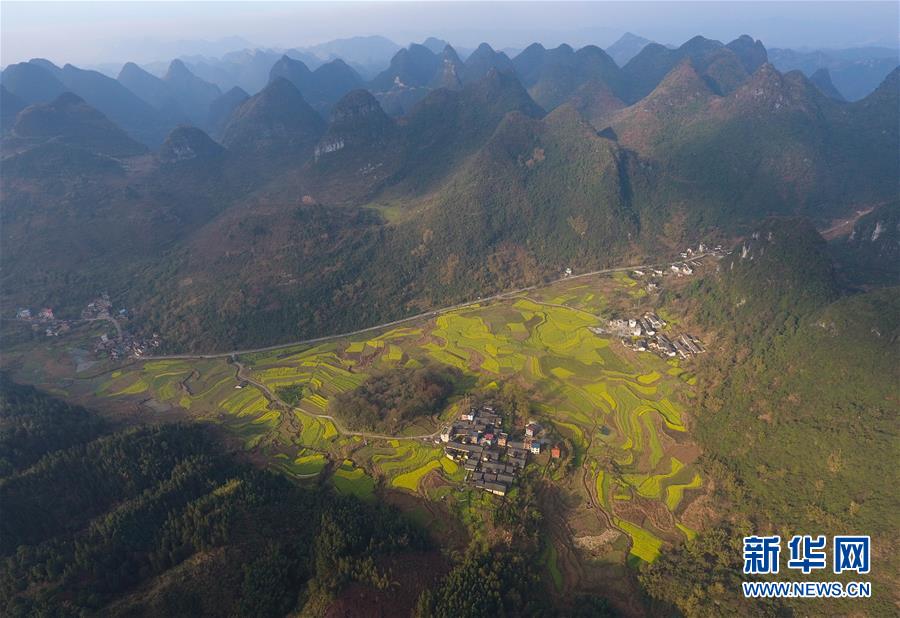 廣西融安縣東起鄉(xiāng)長(zhǎng)豐村的田園春色(3月10日無人機(jī)拍攝)。 近日,隨著氣溫持續(xù)回升,廣西融安縣境內(nèi)的油菜花開放,春意盎然。 新華社記者 黃孝邦 攝