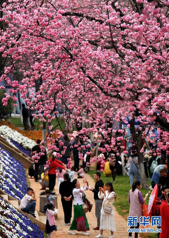 游人在昆明圓通山公園觀賞盛開的櫻花(3月16日攝)。近日,云南省昆明市迎來櫻花盛開的時(shí)節(jié)。昆明圓通山公園的數(shù)千株櫻花燦爛綻放,吸引了市民和游客前來觀花賞景。新華社記者藺以光攝