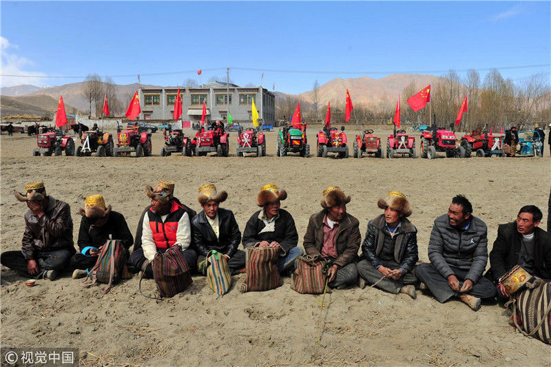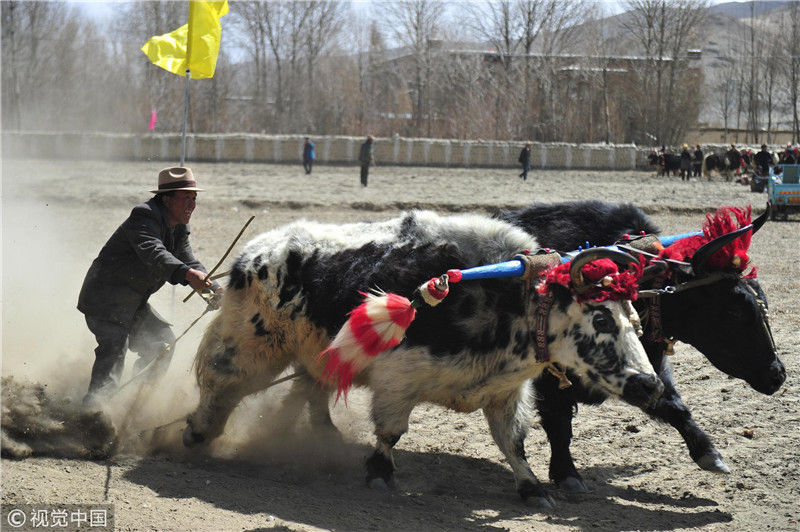 圖為白朗縣洛江鎮(zhèn)農(nóng)牧民進行“賽?!被顒?,只要農(nóng)牧民不從犁上掉下來,便可以獲得一把象征著勞動致富的鐵鍬。