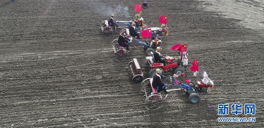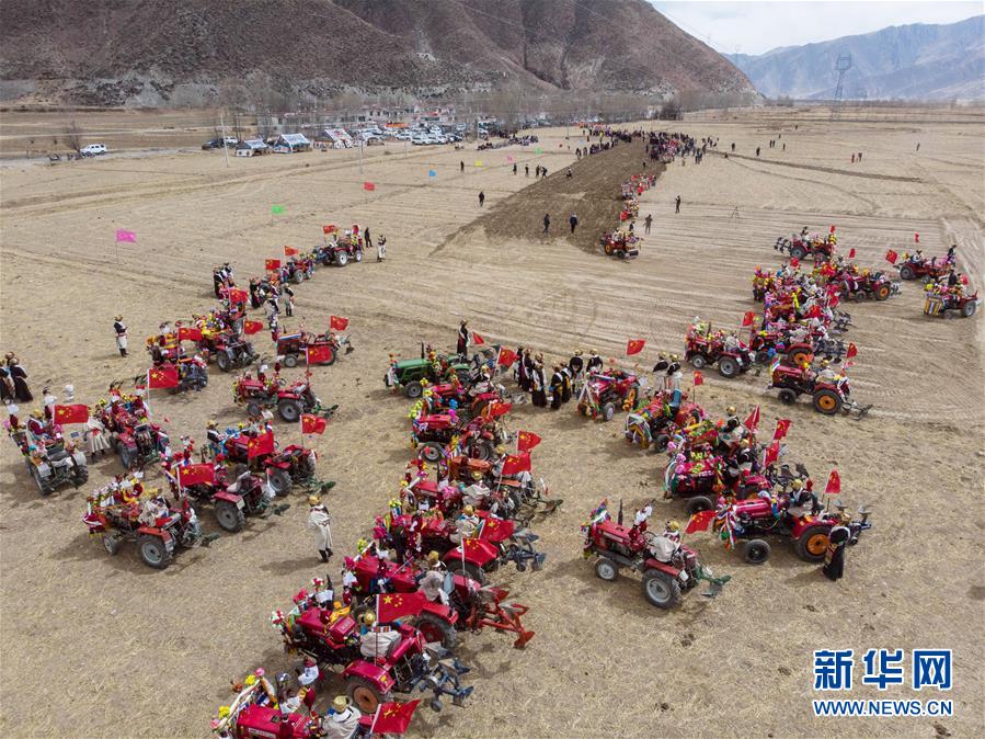 3月16日在拉薩市達孜區(qū)唐嘎鄉(xiāng)拍攝的開耕儀式現(xiàn)場(無人機拍攝)。 當日,西藏各地男女老幼身著節(jié)日盛裝,駕著一輛輛由彩旗、花朵裝扮一新的拖拉機,涌向待墾的農(nóng)田,載歌載舞迎來一年一度的開耕儀式。 新華社發(fā)(孫非 攝)