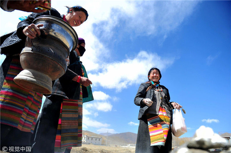 2019年3月16日,西藏各地迎來開耕節(jié)。位于年楚河畔的日喀則白朗縣被譽為“后藏糧倉”,當(dāng)日,當(dāng)?shù)夭刈遛r(nóng)牧民將家里的耕牛裝扮一新,對農(nóng)田進行開耕,大家齊聚青稞地,慶祝春播開始。圖為白朗縣洛江鎮(zhèn)民眾在青稞地里煨桑煙(一種祈福方式)、敬獻青稞酒,祈福新的一年風(fēng)調(diào)雨順、五谷豐登。 江飛波(西藏分社)/中新社/視覺中國 編輯/陳進