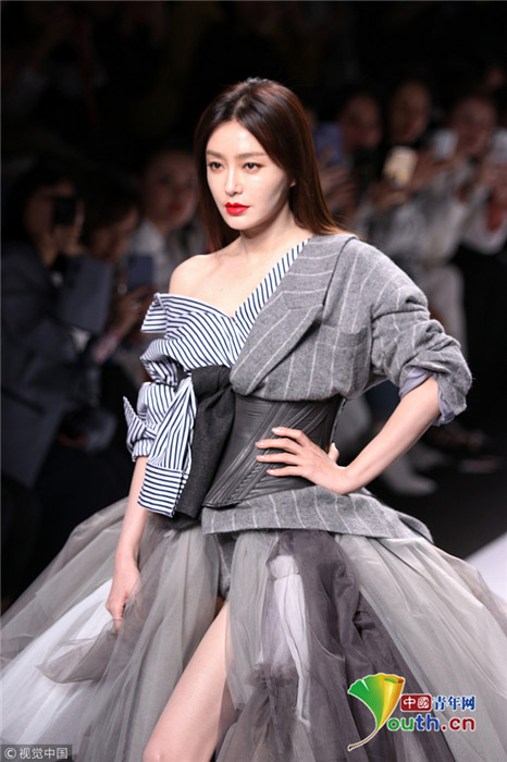 2019年3月31日,上海,2019上海秋冬時(shí)裝周,秦嵐助陣古巨基自創(chuàng)品牌大秀。她穿西裝紗紗裙笑容滿(mǎn)面可鹽可甜,斜肩小西裝正好能露出天鵝頸的線(xiàn)條,性感又不失知性?!拔灏⒏纭惫啪藁鶆t穿著隨性,與“知畫(huà)”牽手走秀,引起滿(mǎn)滿(mǎn)“回憶殺”。