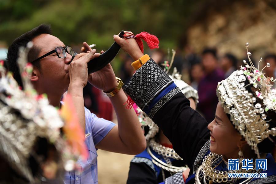 苗族群眾給來(lái)賓敬牛角酒(4月6日攝)。4月6日至7日,在貴州省黔東南苗族侗族自治州劍河縣觀么鎮(zhèn)新民村和新合村,來(lái)自劍河縣和三穗縣的苗族同胞歡聚一堂,通過(guò)民族歌舞展演、非遺手工藝展示、千戶祭“巫耶”、跳蘆笙舞等形式,與來(lái)賓一起歡慶2019年高雍苗族“三月三”民俗文化節(jié)。 新華社記者 楊文斌 攝