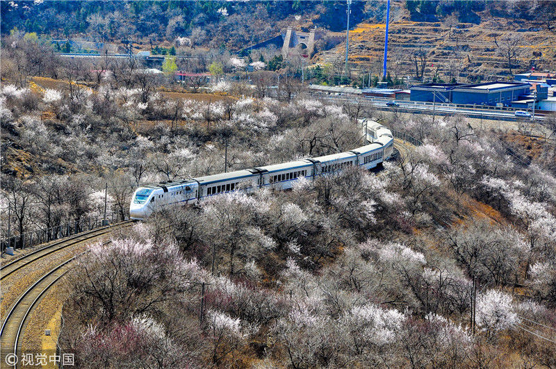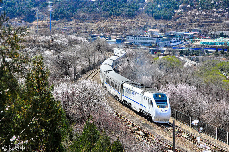 2019年3月22日,北京居庸關(guān)附近的山花盛開,S2線列車穿行在花海之中,構(gòu)成一幅美麗的畫面。時(shí)永平/千龍圖像/視覺(jué)中國(guó) 編輯/陳進(jìn)