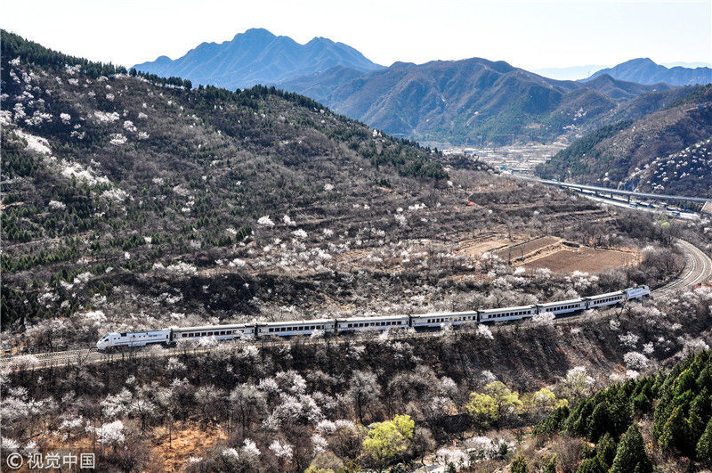 2019年3月22日,北京居庸關(guān)附近的山花盛開(kāi),S2線(xiàn)列車(chē)穿行在花海之中,構(gòu)成一幅美麗的畫(huà)面。